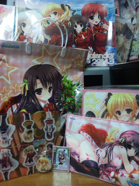 うさぎのみみ(悠稀れい)「幼なじみ彼女はダイタン!?」「ういんどめもりー」、まからっこ(松下まかこ、らっこ)「冬コミセット」、CASCADE(支倉ちあき)「冬コミセット」。まからっこはラストというだけあって列は長かったです。それで忙しかったためかクリアファイルが4枚も入ってましたwww返そうにもラスト参加なので無理ですね。CASCADEはさすがにLyceeへのサインは諦めましたwww