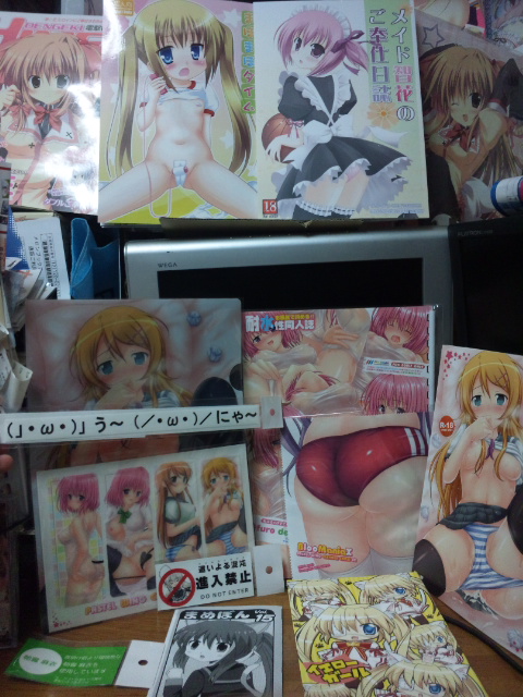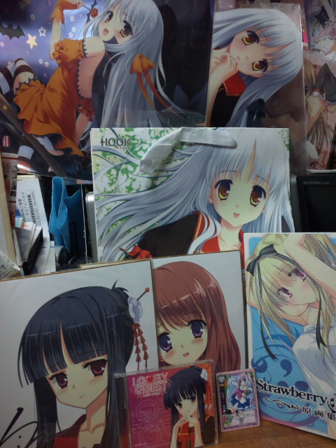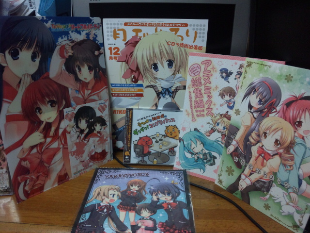 To Heart2ハートフルパーティのクリアファイル×3、めろり出張版、47都道府犬ギリギリコンプライアンスCD、山猫BOXのアニメミックス総集編、お茶会はとまらない、購入特典ハンドタオル。山猫で中二病本買ってないのにwww東鳩2がモバゲに進出って・・・。またプレイするソーシャルゲームが増えてしまう・・・・・。
