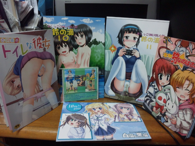 ジューシーフルーツ「さくら荘のトイレな彼女」、鈴の丘「鈴の滴10」「鈴の滴11」「水着DEおしっこ」、クォーターアイスショップ「外道少女本気狩!?なのはさん10」、白猫と黒猫「D.C.10周年記念本」。さくら荘〜は話の展開が面白かったwましろさん、1人でトイレ行けないwww